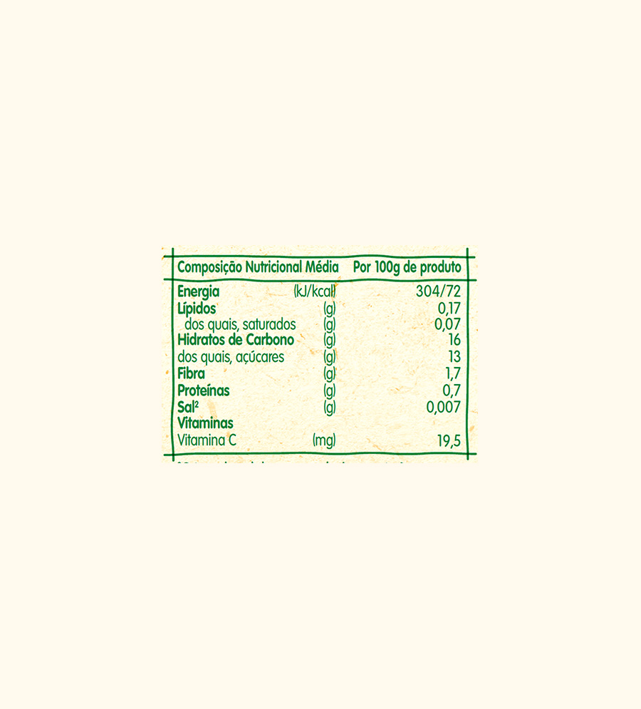Maçã 73%, banana 22%, sumo de laranja concentrado 5%, ácido ascórbico (vitamina C).